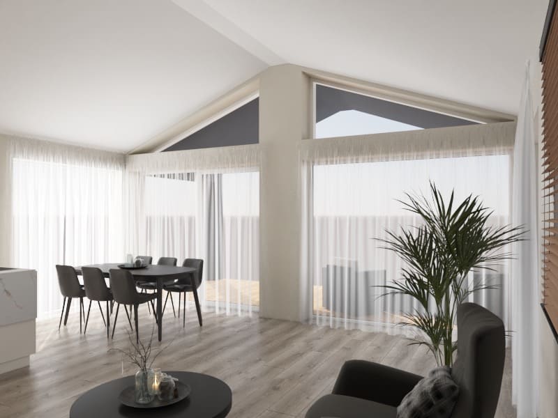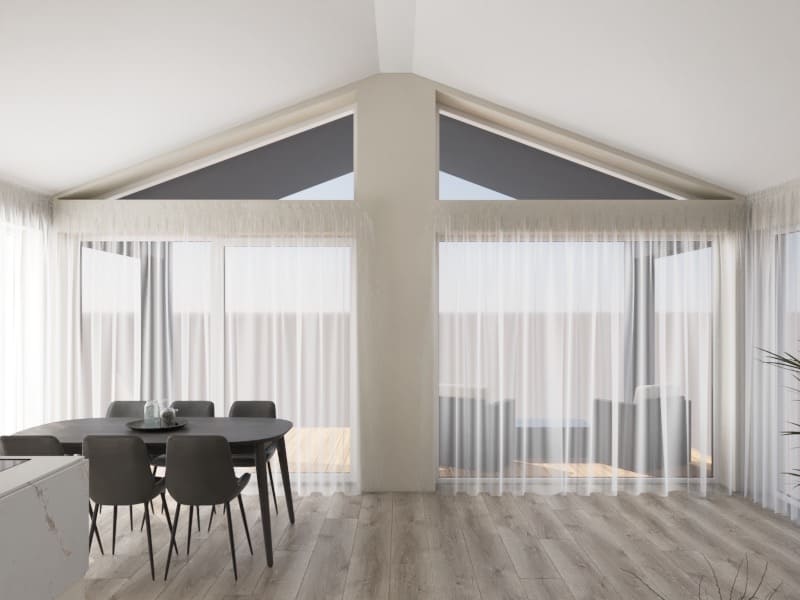 Húsið er klætt að utan með hvítri RAL 9016 viðarklæðningu.