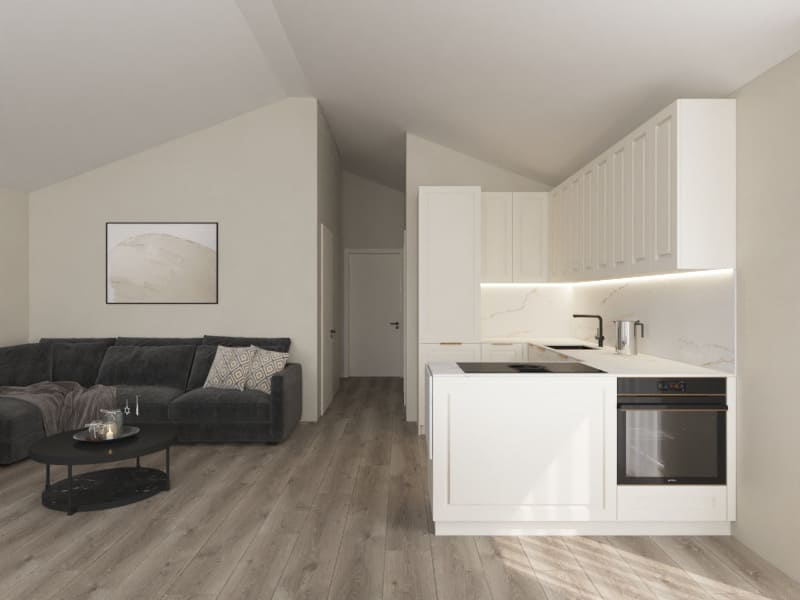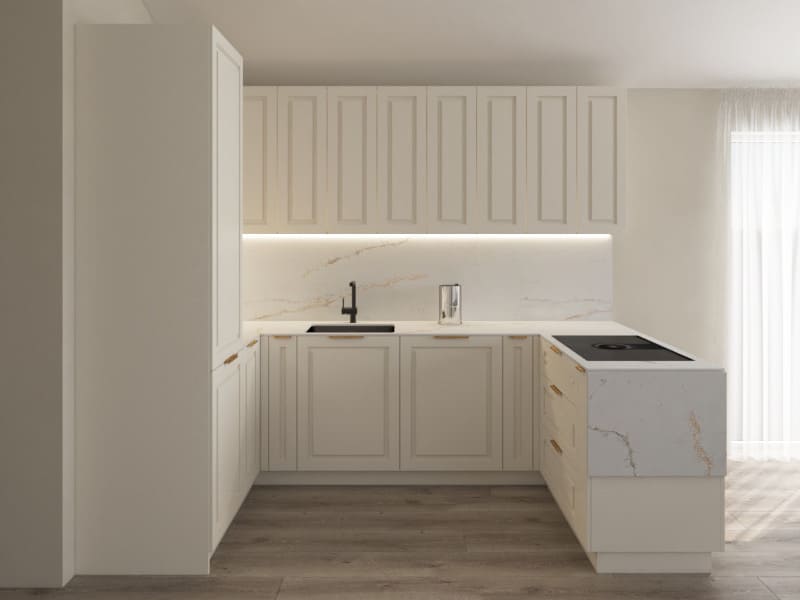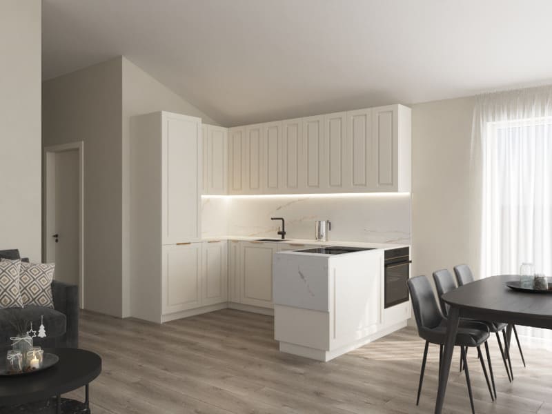 Í eldhúsi er hvít fulninga innrétting RAL 9010 og ljós avant quartz borðplata, Electrolux ísskápur með frysti, Electrolux innbyggð uppþvottavél, Electrolux bakaraofn, Elica helluborð og innbyggð vifta í helluborði. Hvítt eldhúsborð og stólar.